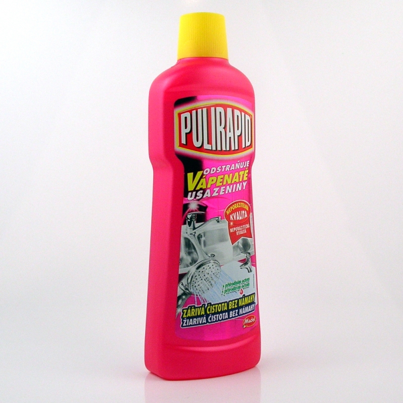 Pulirapid s přísadou octu čistí do vysokého lesku bez poškrábání nerezové dřezy, nádobí, vodovodní kohoutky, keramické obklady, dlažby, umývadla, vany, apod. Čtěte důkladně bezpečnostní upozornění.Návod k použití: Na malé plochy: nerezové vodovodní baterie, keramická umyvadla, vany a bidety - nastříkejte pár kapek na vlhkou houbu nebo hadřík, očistěte žádané předměty a poté opláchněte vodou. Na zvláště znečištěné nerezové části praček, myček, napařovacích žehliček, konvic na čaj, kávovarů apod. nalijte přípravek nezředěný, nechejte působit několik minut a potom dobře opláchněte. Očištěné předměty budou krásně zářit.
