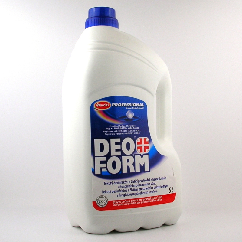 Tekutý dezinfekční a čistící prostředek s baktericidním a fungicidním působením s vůní.Návod k použití: Deoform je určen pro dezinfekci a čištění ploch a předmětů (podlahy, nábytek, plastické hmoty, sanitární zařízení apod.) ve zdravotnictví, komunální oblasti a domácnostech.