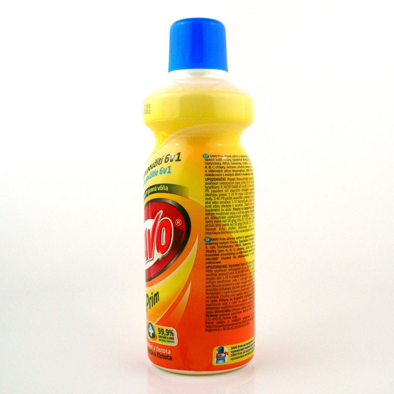 Savo Prim - dezinfekční prostředek na mytí podlahKapalný koncentrát se zvýšenou mycí schopností. Pro jednofázovou dezinfekci a mytí podlah a pevných povrchů s velmi dobrými dezinfekčními a mycími schopnostmi. Likviduje plísně na stěnách, keramických obkladech a dřevě. Odstraňuje nepříjemné pachy. Nesmí přijít do styku s potravinami.